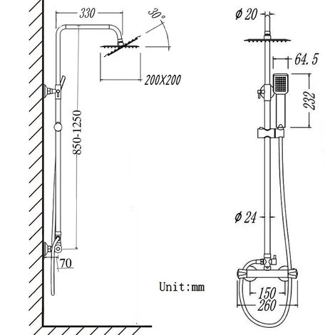 - Shower Top to Bottom Adjustability: 850mm ¨C 1250mm