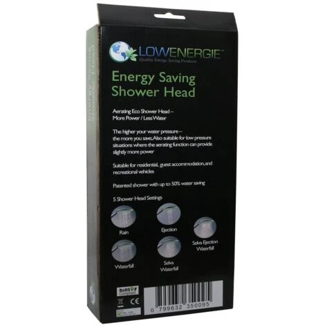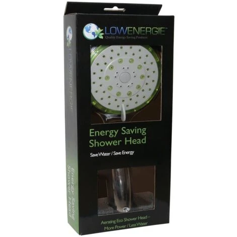 Low pressure water flow (approx 28% less water/ energy usage), Conventional shower 3.5 Litres/ minute, Lowenergie shower 2.5 Litres/ minute