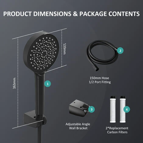 - Products include: Hand shower with 6 spraying methods + 1.5m stainless steel hose + 1 replacement carbon filter + 1 wall bracket