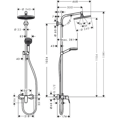 - Consists of: overhead shower, hand shower, single lever manual shower mixer, shower hose, hand shower holder, shower bar