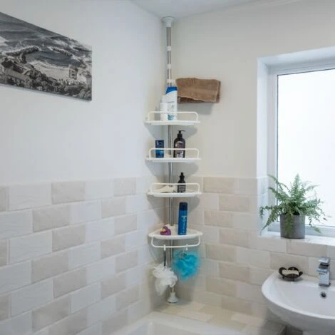 The KCT 4 Tier Bathroom Caddy can be mounted in the corner of your shower/bath area via the extendable pole. Perfect for storing your shampoos and cleaning products, as well as featuring a hanger for your towel.