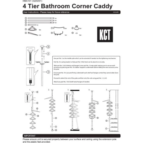 To use the KCT 4 Tier Bathroom Caddy simply assemble the main poles depending on how tall you wish the caddy to be, and place it in the corner of your bathroom area making sure to extend the pole until it is touching your ceiling and is mounted securely (rubber feet are included). The 4 shelves provide a lot of space to store your bathroom products and are simply slid onto the pole during assembly.