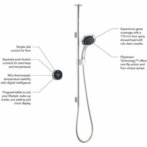 - Four spray showerhead – Mira Platinum comes with a Mira 360 showerhead complete with Flipstream Technology – 1 flip action, 4 unique sprays