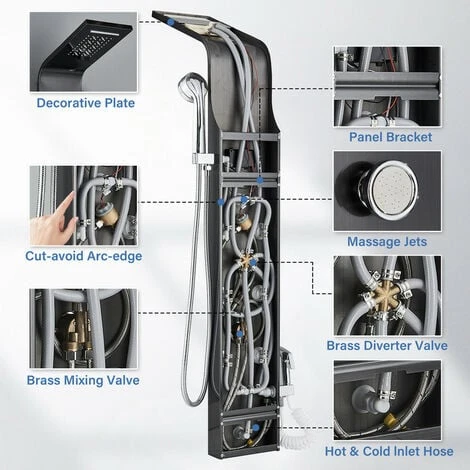 Material: thick nickel-plated 304 stainless steel, brass fittings, anti-corrosion material and explosion-proof pipe make this shower panel an upgrade. The brushed nickel appearance in European and American style, multi-layer electroplating through a 48-hour acid salt spray test, can easily cope with wet and corrosive toilets.