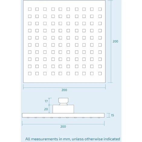 - Overhead shower dimensions – 200mm x 200mm x 8mm